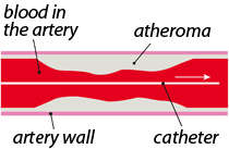 然后将导管末端的气球轻轻充气,以便将脂肪沉积物(动脉粥样化)压在动脉壁上,使动脉变宽。