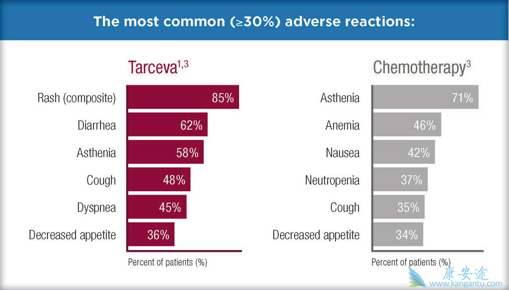 在Tarceva治疗的患者中,最常报告的导致剂量改变的不良反应为皮疹(13%),腹泻(10%)和乏力(3.6%)。